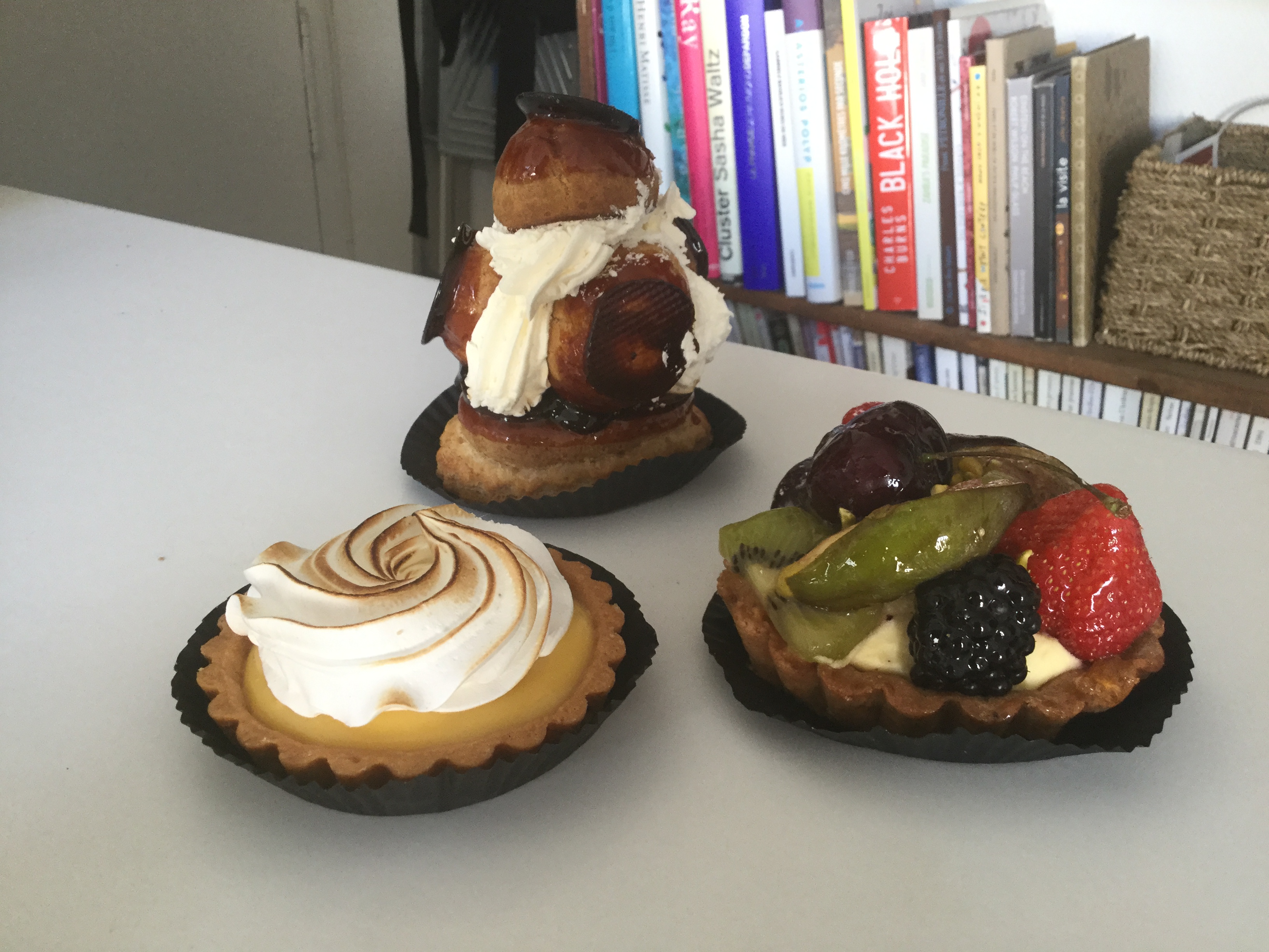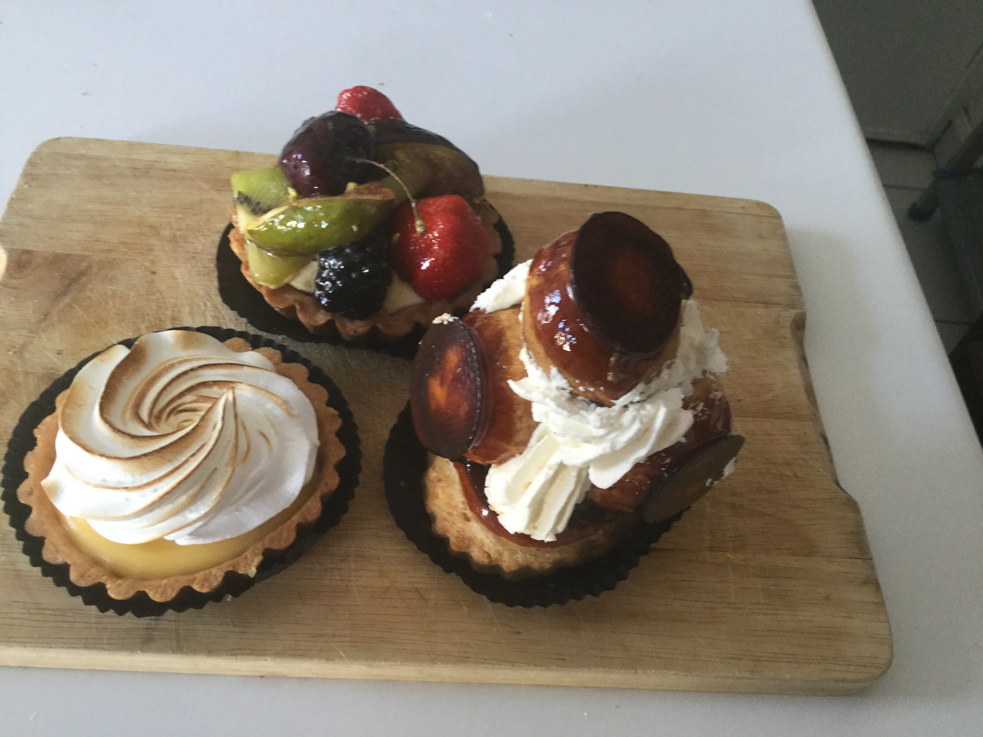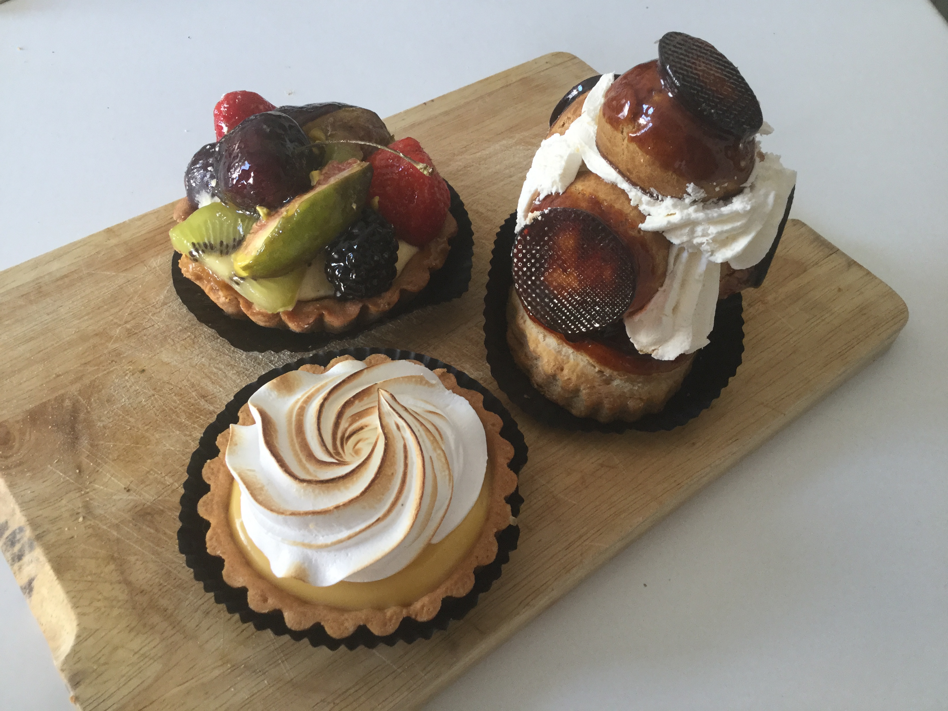 A belated Bastille day special starring not one, not two but three luscious treats and at under 3 euros each, why not? The St Honore takes the cake (sorry) for being the tallest and therefore the hardest patisserie to transport home intact and was difficult to photograph without it resembling a snowman. In truth it is a little sweet and rich with all the cream and toffee, but is such an impressive looking gateau it is hard to go past. Light airy choux puffs that weren’t overfilled dipped in dark, crunchy toffee with appropriate depth and a trace of bitterness. I wouldn’t normally try a mixed fruit tart but I haven’t seen many and the colours looked so inviting. This tart has cherries, peach, kiwi, strawberries, fig and a fat mulberry nestled on a bed of creme patissiere and dusted with crushed pistachios. It is a classic of its type but will never make it to the top of my list. Last but not least a tarte citron. This is very aromatic, the meringue doesn’t dominate and the curd is creamy and luscious but it is not as tangy as I like. La Baguette de Paris is a lovely boulangerie on Rue Basfroi off Rue Charonne. All the patisserie looked inviting and the shop was very busy. I don’t know whether I prefer these unpretentious classic patisseries or the more refined, carefully constructed, slightly self conscious versions in the more chic establishments, but I will definitely be going back for more.